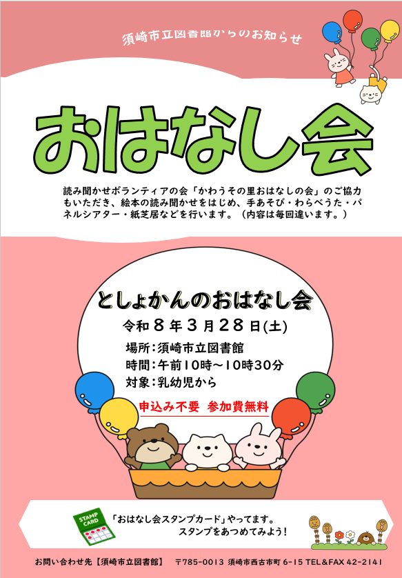 としょかんのおはなし会は、3/28(土)に須崎市立図書館で行います。