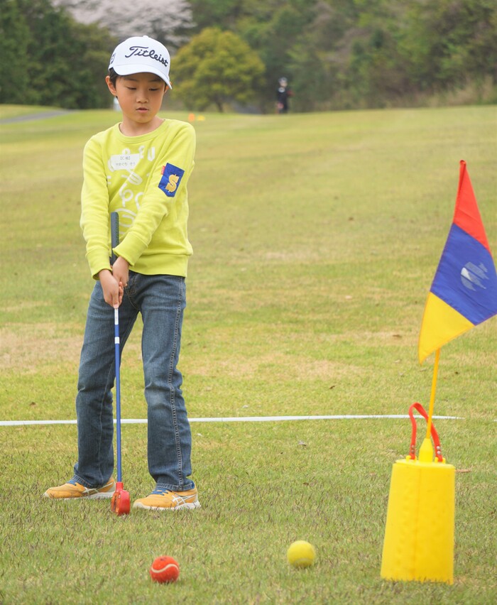 誰でも簡単に楽しめるスナッグゴルフ。クラブのヘッドの部分が従来のゴルフと比べて3倍強あるので、しっかりとボールを打つことができます。ボールがフラッグにくっつくとホールアウト。