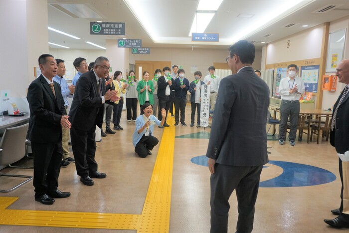 退庁時に見送りに集まった職員に、「ありがとう!また必ず帰ってきます!」と笑顔で手を振りました。