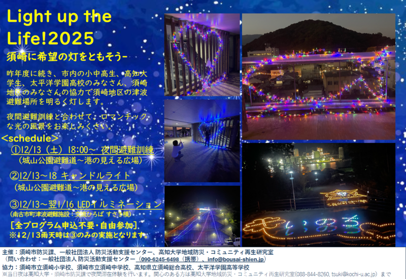 また、当日は、城山公園避難道や南古市町津波避難施設をイルミネーションやキャンドルライトでライトアップします。この点灯は、須崎小学校・須崎中学校・須崎総合高校・高知大学・太平洋学園高校の生徒や地域住民の皆さんの協力で行われます。