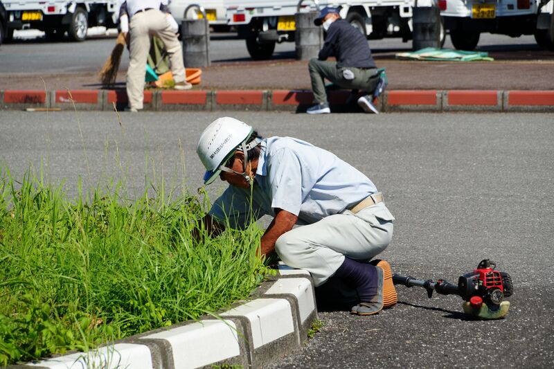 ▲熟練の技術で草刈り機を扱います。
