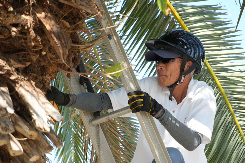 ▲ロータリー中央のソテツも、枯れた葉を丁寧に剪定して見栄えが良くなりました。