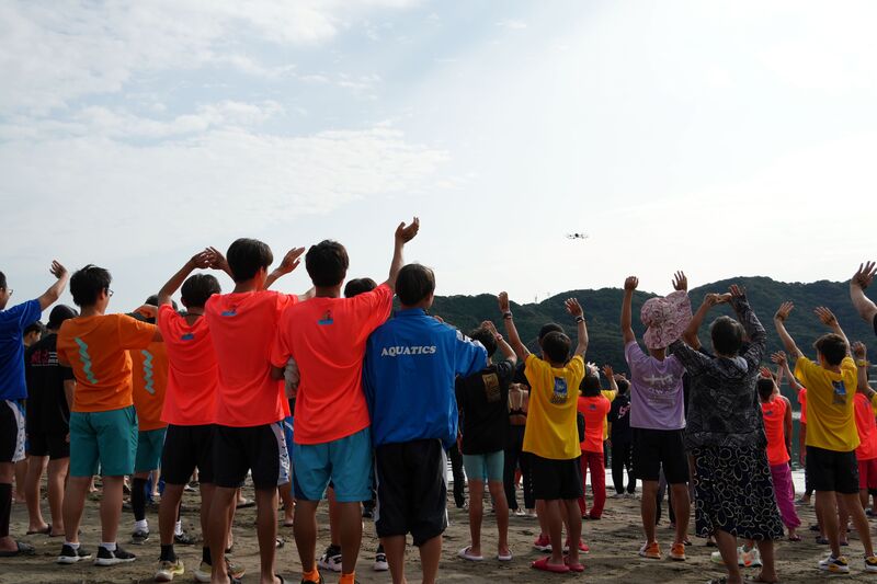 空撮のドローンに向かって手を振る選手たち