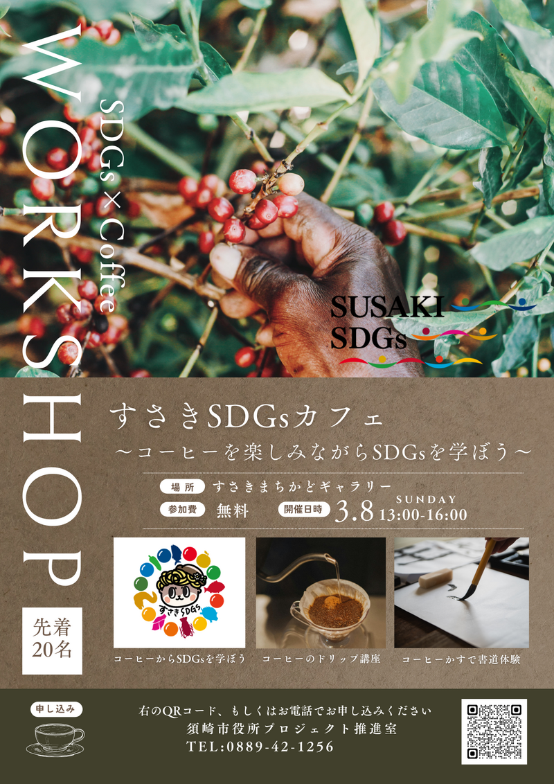 須崎市では、持続可能なまちづくりの推進を目的として、コーヒーを通じてSDGsについて学んでいただく「すさきSDGsカフェ~コーヒーを楽しみながらSDGsを学ぼう」を開催します。