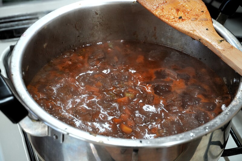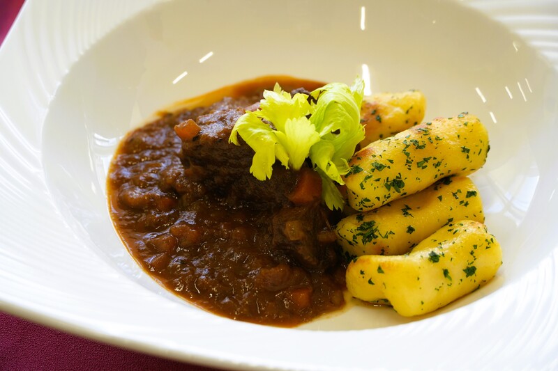 ▲メインの「イノシシ肉のシチュー」と添え物の「シュラーンキ(ジャガイモのニョッキ)」
