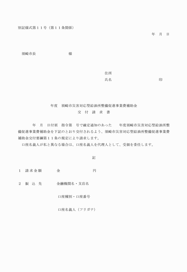 第4条 補助対象事業者は、補助金の交付を受けようとするときは、須崎市災害対応型給油所整備促進事業費補助金交付申請書(別記様式第1号)を市長に提出しなければならない。