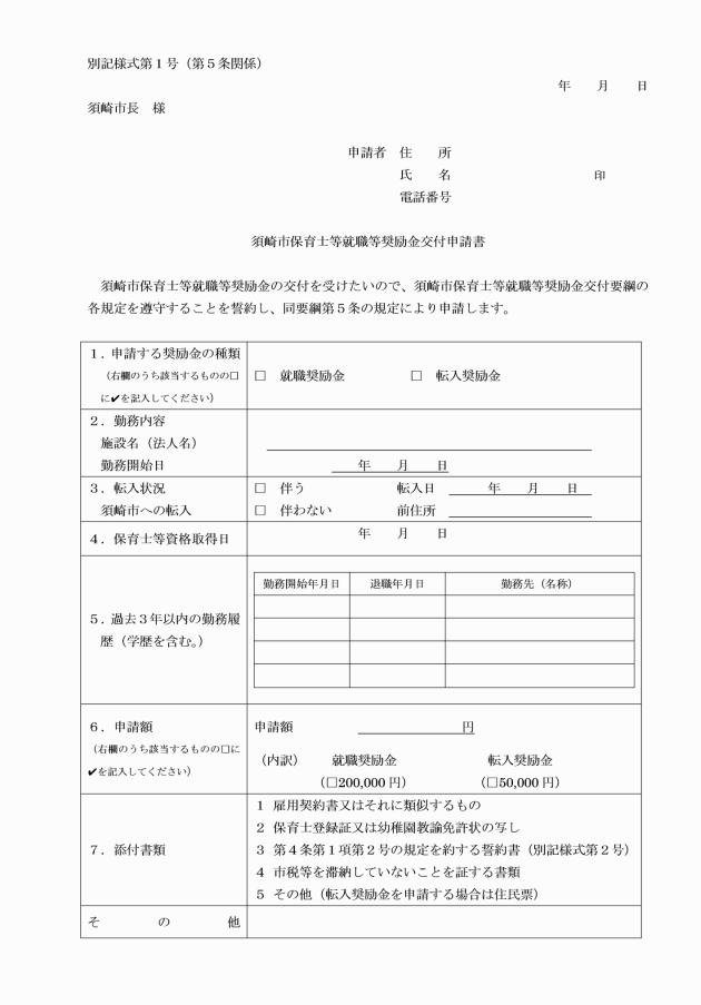第5条 就職奨励金及び転入奨励金の交付を受けようとする者(以下「交付申請者」という。)は、勤務開始日から3月を経過する日までに、須崎市保育士等就職等奨励金交付申請書(別記様式第1号)に次に掲げる書類を添えて、市長に申請しなければならない。