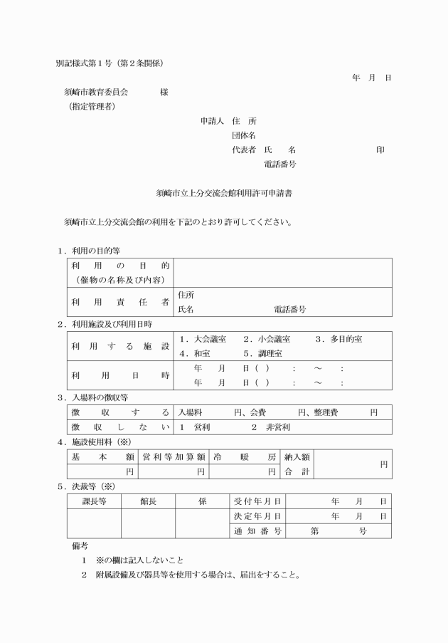 第3条 教育委員会は、利用許可申請があった場合において、施設の利用を許可するときは、須崎市立上分交流会館利用許可書(別記様式第2号)により、許可しないときは、その旨を、それぞれ当該申請者に通知するものとする。