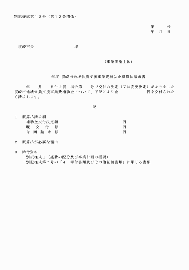 第13条 事業実施主体は、補助金の概算払の請求をしようとするときは、須崎市地域営農支援事業費補助金概算払請求書(別記様式第12号)を市長に提出しなければならない。