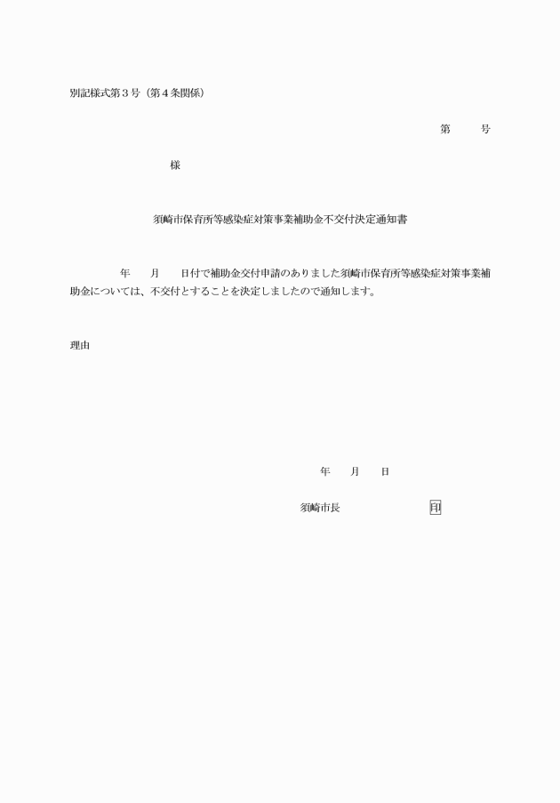 第3条 補助金の交付申請(以下「交付申請」という。)をしようとするときは、須崎市保育所等感染症対策事業補助金交付申請書(別記様式第1号)を市長に提出しなければならない。
