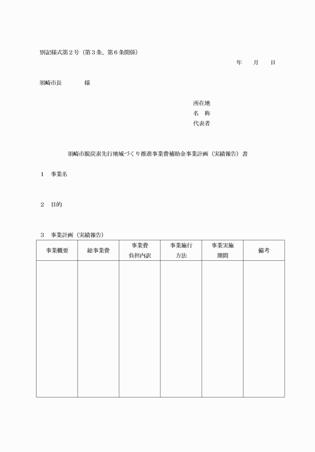 第3条 事業実施主体は、補助金の交付の申請(以下「交付申請」という。)をしようとするときは、須崎市脱炭素先行地域づくり推進事業費補助金交付申請書(別記様式第1号)に次に掲げる書類を添えて市長に提出しなければならない。