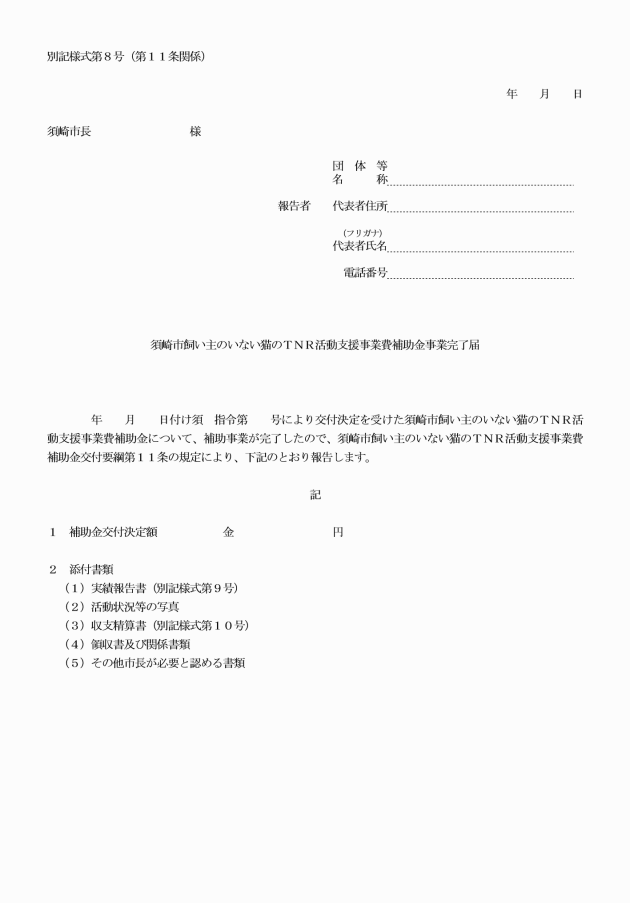 (1) 須崎市飼い主のいない猫のTNR活動支援事業費補助金事業完了届(別記様式第8号)