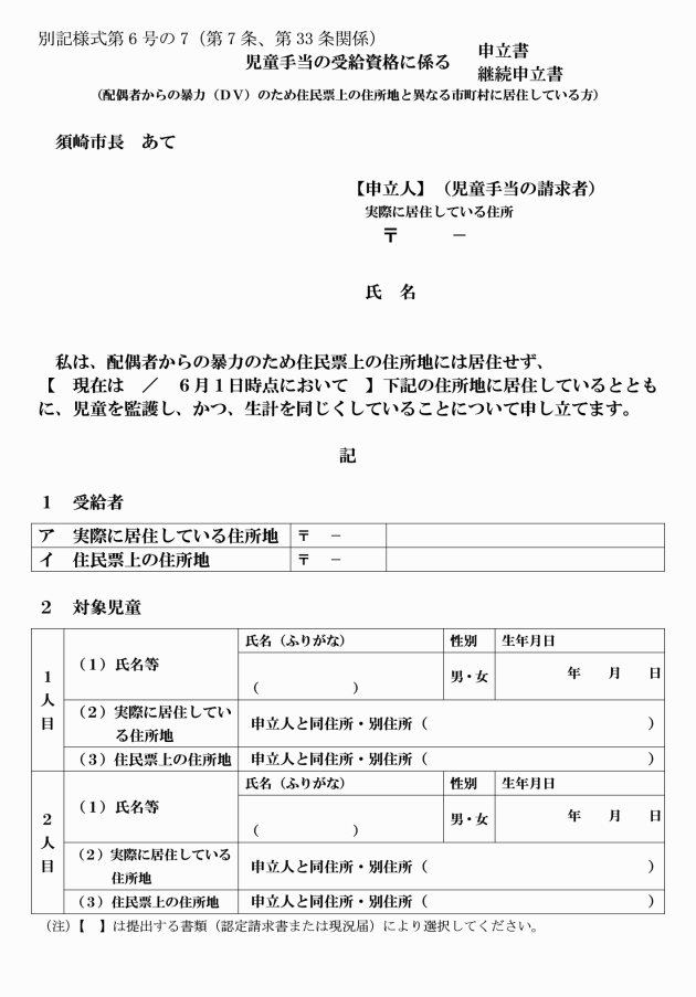 ケ 住民票上の住所地が本市でない請求者が、配偶者からの暴力を理由に本市に請求したときは、「児童虐待・DV事例における児童手当関係事務処理について」(平成24年3月31日付け雇児発第4号厚生労働省雇用均等・児童家庭局長通知。以下「児童虐待・DV通知」という。)」の第二の1により支給要件を確認するほか、DVのため住民票上の住所地と異なる市町村に居住している旨の申立書(別記様式第6号の7)又は生活の本拠が分かる書類等により実際の住所地を確認すること。